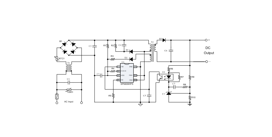 SP6606HPS在PWM模式下工作于固定頻率,這個(gè)頻率是由內(nèi)部精確設(shè)定的。在空載或者輕載時(shí),工作頻率由IC內(nèi)部調(diào)整。芯片可以工作在綠色模式,以此來(lái)減小輕載時(shí)的損耗,提高整機(jī)的工作效率,SP6606HPS在啟動(dòng)和工作時(shí)只需要很小的電流,可以在啟動(dòng)電路中使用一個(gè)很大的電阻,以此來(lái)進(jìn)一步減小待機(jī)時(shí)的功耗。芯片內(nèi)置有斜坡補(bǔ)償電路,當(dāng)電路工作于大占空比時(shí),避免次諧波振蕩的發(fā)生,改善系統(tǒng)的穩(wěn)定性。內(nèi)置有前沿消隱時(shí)(Leading-edge blanking time),消除緩沖網(wǎng)絡(luò)中的二極管反向恢復(fù)電流對(duì)電路的影響。SP6606HPS采用了抖頻技術(shù),能夠有效改善系統(tǒng)的EMI性能。系統(tǒng)的跳頻頻率設(shè)置在音頻(20KHz)以上,在工作時(shí)可以避免系統(tǒng)產(chǎn)生噪音。SP6606HPS內(nèi)置多種保護(hù),包括逐周期限流保護(hù)(OCP),過(guò)載保護(hù)(OLP),過(guò)壓保護(hù)(OVP),VDD過(guò)壓箝位,欠壓保護(hù)(UVLO),過(guò)溫保護(hù)(OTP)等,通過(guò)內(nèi)部的圖騰柱驅(qū)動(dòng)結(jié)構(gòu)可以更好的改善系統(tǒng)的EMI特性和開(kāi)關(guān)的軟啟動(dòng)控制。