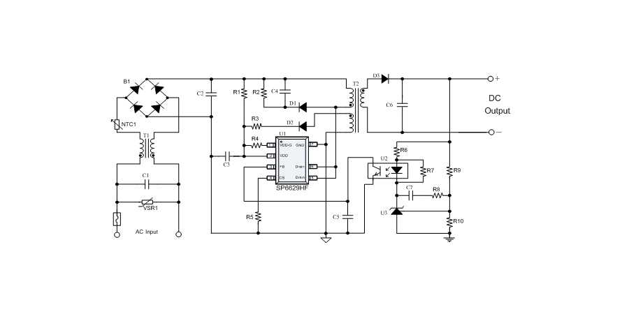 SP6629HF在PWM模式下工作于固定頻率,這個頻率是由內(nèi)部精確設定的。在空載或者輕載時,工作頻率由IC內(nèi)部調(diào)整。芯片可以工作在綠色模式,以此來減小輕載時的損耗,提高整機的工作效率,SP6629HF在啟動和工作時只需要很小的電流,可以在啟動電路中使用一個很大的電阻,以此來進一步減小待機時的功耗。芯片內(nèi)置有斜坡補償電路,當電路工作于大占空比時,避免次諧波振蕩的發(fā)生,改善系統(tǒng)的穩(wěn)定性。內(nèi)置有前沿消隱時(Leading-edge blanking time),消除緩沖網(wǎng)絡中的二極管反向恢復電流對電路的影響。SP6629HF采用了抖頻技術(shù),能夠有效改善系統(tǒng)的EMI性能。系統(tǒng)的跳頻頻率設置在音頻(20KHz)以上,在工作時可以避免系統(tǒng)產(chǎn)生噪音。SP6629HF內(nèi)置多種保護,包括逐周期限流保護(OCP),過載保護(OLP),過壓保護(OVP),VDD過壓箝位,欠壓保護(UVLO),過溫保護(OTP)等,通過內(nèi)部的圖騰柱驅(qū)動結(jié)構(gòu)可以更好的改善系統(tǒng)的EMI特性和開關的軟啟動控制。SP6629HF使用SOP7無鉛封裝。