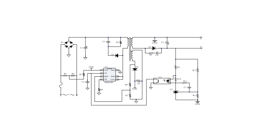 SP6658P是一顆高性能、多工作模式的PWM控制芯片。芯片可以工作在跳頻及綠色模式,以此來減小空載和輕載時的損耗,也可以工作在QR工作模式及CCM工作模式,提高整機的工作效率。SP6658P在啟動和工作時只需要很小的電流,可以在啟動電路中使用一個很大的電阻,以此來進一步減小待機時的功耗。SP6658P內(nèi)置多種保護,包括:輸入電壓過低保護(Brown-out),輸出電壓短路保護,VDD過壓保護(OVP),VDD過壓箝位,VDD欠壓保護(UVLO),過溫保護(OTP)等。