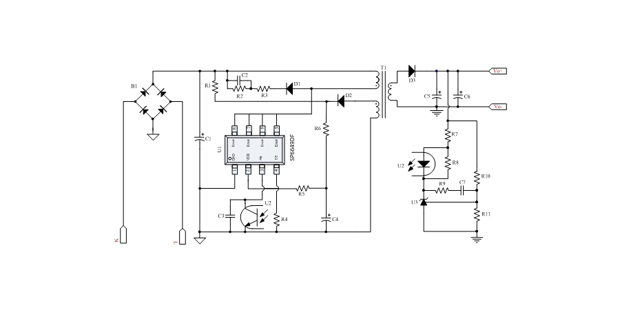 SP6649DF內(nèi)置多種保護(hù),包括逐周期限流保護(hù)(OCP),過載保護(hù)(OLP),過壓保護(hù)(VDD OVP),VDD過壓箝位,欠壓保護(hù)(UVLO),過溫保護(hù)(OTP)等,通過內(nèi)部的圖騰柱驅(qū)動結(jié)構(gòu)可以更好的改善系統(tǒng)的EMI特性和開關(guān)的軟啟動控制。