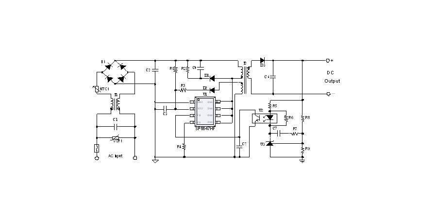 SP6647HF是一顆電流模式PWM控制芯片,內(nèi)置650V高壓功率MOSFET,應用于功率在15W以內(nèi)的方案。SP6647HF在PWM模式下工作于固定開關(guān)頻率,這個頻率是由內(nèi)部精確設(shè)定。在空載或者輕載時,工作頻率由IC內(nèi)部調(diào)整。芯片可以工作在綠色模式,以此來減小輕載時的損耗,提高整機的工作效率。SP6647HF在啟動和工作時只需要很小的電流,可以在啟動電路中使用一個很大的電阻,以此來進一步減小待機時的功耗。芯片內(nèi)置有斜坡補償電路,當電路工作于大占空比時,避免次諧波振蕩的發(fā)生,改善系統(tǒng)的穩(wěn)定性。內(nèi)置有前沿消隱時(Leading-edge blanking time),消除緩沖網(wǎng)絡中的二極管反向恢復電流對電路的影響。SP6647HF采用了抖頻技術(shù),能夠有效改善系統(tǒng)的EMI性能。系統(tǒng)的跳頻頻率設(shè)置在音頻(22KHz)以上,在工作時可以避免系統(tǒng)產(chǎn)生噪音。SP6647HF內(nèi)置多種保護,包括逐周期限流保護(OCP),過載保護(OLP),過壓保護(VDD OVP),VDD過壓箝位,欠壓保護(UVLO),過溫保護(OTP)等,通過內(nèi)部的圖騰柱驅(qū)動結(jié)構(gòu)可以更好的改善系統(tǒng)的EMI特性和開關(guān)的軟啟動控制。