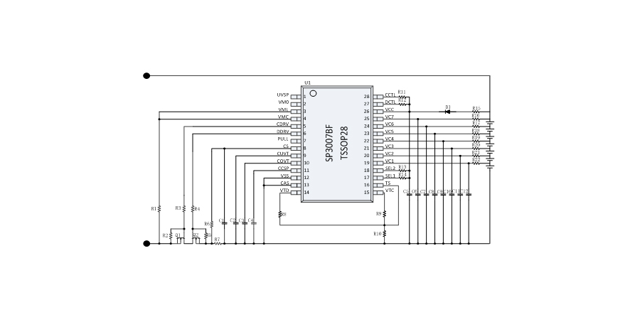 SP3007BF是一款用于6-7串鋰電池的保護(hù)芯片,SP3007BF 內(nèi)部集成了高精度的電壓、電流檢測電路,能夠?qū)崿F(xiàn)每串電池的過壓、欠壓保護(hù),以及整串電池的充電過流、放電過流、短路保護(hù)和充放電的溫度保護(hù)等。SP3007BF 內(nèi)部集成 N型 MOSFET 的驅(qū)動電路,能夠直接驅(qū)動外部 N 型充電管和放電管,既可以兼容充放電分口應(yīng)用,也可以兼容充放電同口應(yīng)用。