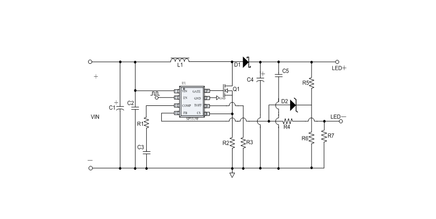 SP5519F提供完善的保護(hù)功能,包括輸入電壓欠壓保護(hù)(UVLO)、逐周期的功率管過流保護(hù)(OCP)、過溫保護(hù)(OTP)。