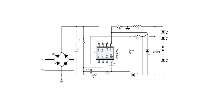 SP5324AF是一款非隔離降壓型單級(jí)PFC高性能LED照明轉(zhuǎn)換電路,內(nèi)置550V高壓MOSFET,具有應(yīng)用外圍器件極少,設(shè)計(jì)簡單,功率因數(shù)高,恒流精度高等優(yōu)點(diǎn)。采用準(zhǔn)諧振開啟的控制方式,提升了轉(zhuǎn)換效率。外圍應(yīng)用采用浮地架構(gòu),實(shí)現(xiàn)對(duì)電感電流進(jìn)行全周期采樣,得到極高的恒流精度。