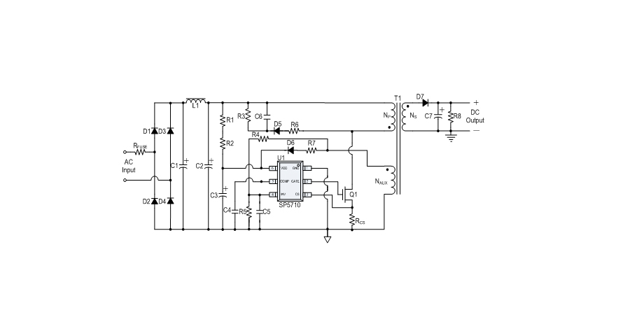 SP5710是一顆高精度離線式開關(guān)電源電路,應(yīng)用于低功耗AC/DC充電器與適配器。SP5710使用原邊取樣來進行精確的恒流、恒壓控制,可以省去一般應(yīng)用中的光耦與TL431。