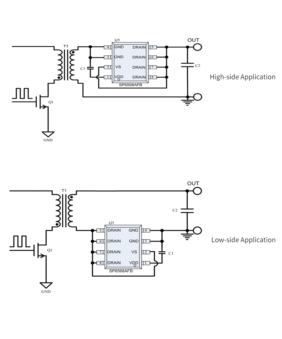 SP6568AFB是一顆高性能的開關電源次級側同步整流控制電路。在低壓大電流開關電源應用中,輕松滿足6級能效,是理想的超低導通壓降整流器件的解決方案。芯片可支持高達150KHz的開關頻率應用,并且支持CCM / QR / DCM等開關電源工作模式應用,其極低導通壓降產生的損耗遠小于肖特基二極管的導通損耗,極大提高了系統(tǒng)的轉換效率,大幅降低了整流器件的溫度。