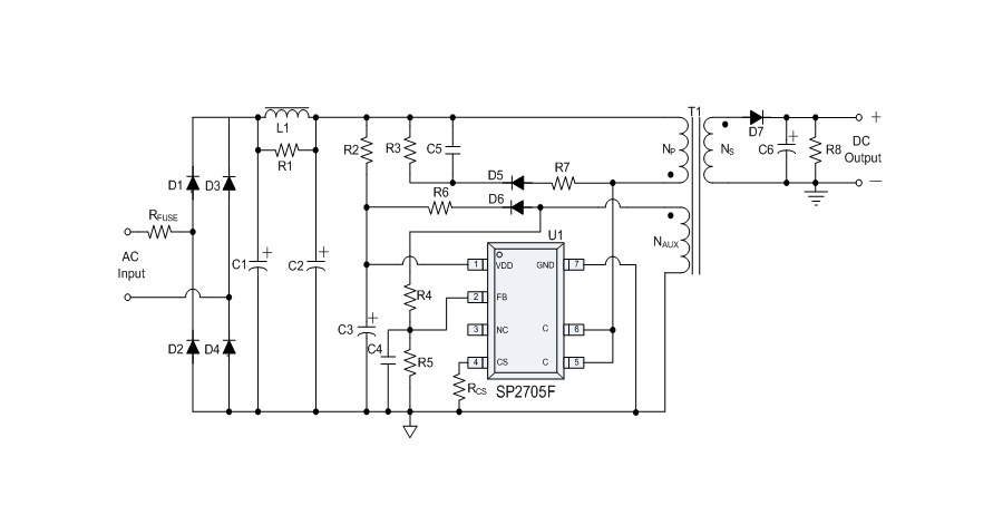 SP2705F非常適合低成本應用方案,內置環(huán)路補償,無需外置補償電容;采用原邊反饋控制,無需光耦和TL431。
