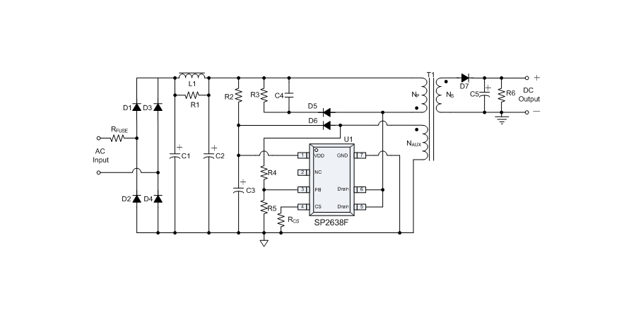 SP2638F 提供全面的保護(hù)功能,包括逐周期限流保護(hù)(OCP)、VDD 過(guò)壓保護(hù)(OVP)、VDD 欠壓保護(hù)(UVLO)、反饋環(huán)路開路保護(hù)、輸出短路保護(hù)、輸出過(guò)壓保護(hù)、過(guò)溫保護(hù)等。其中,輸出短路保護(hù)、輸出過(guò)壓保護(hù)具有自動(dòng)重啟恢復(fù)的功能。