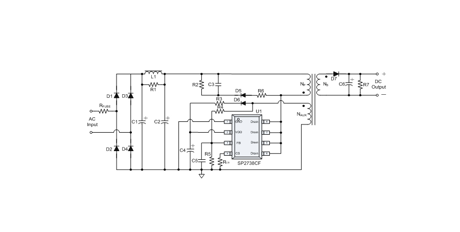 SP2738CF提供全面的保護(hù)功能,包括逐周期限流保護(hù)(OCP)、VDD過壓保護(hù)(OVP)、VDD欠壓保護(hù)(UVLO)、VDD鉗位、FB開/短路保護(hù)、輸出短路保護(hù)、輸出過壓保護(hù)、過溫保護(hù)等。